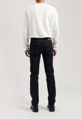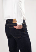 Die dunkle Indigo-Waschung wirkt hochwertig und clean – und lässt sich vielseitig kombinieren: Mit Hemd und Schnürschuhen wirkt sie gepflegt und seriös, mit T-Shirt und Sneakern eher sportlich und unkompliziert. Und falls du dich öfter mal in Bodennähe bewegst – zum Beispiel als Elternteil im Action-Modus – wirst du den soften, leicht elastischen Denim besonders zu schätzen wissen.